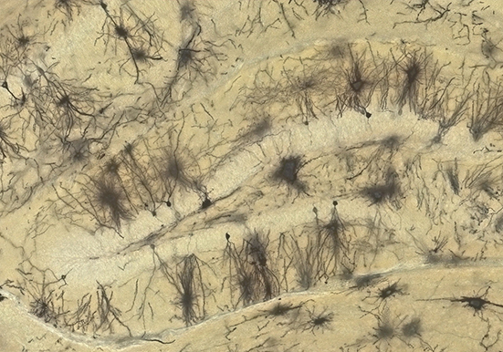 银 Golgi 染色原理:浸泡脑组织的重铬酸钾溶液与硝酸银溶液发生反应,生成黑色的铬酸银沉淀,由于组织的嗜银性而沉积于神经细胞中。